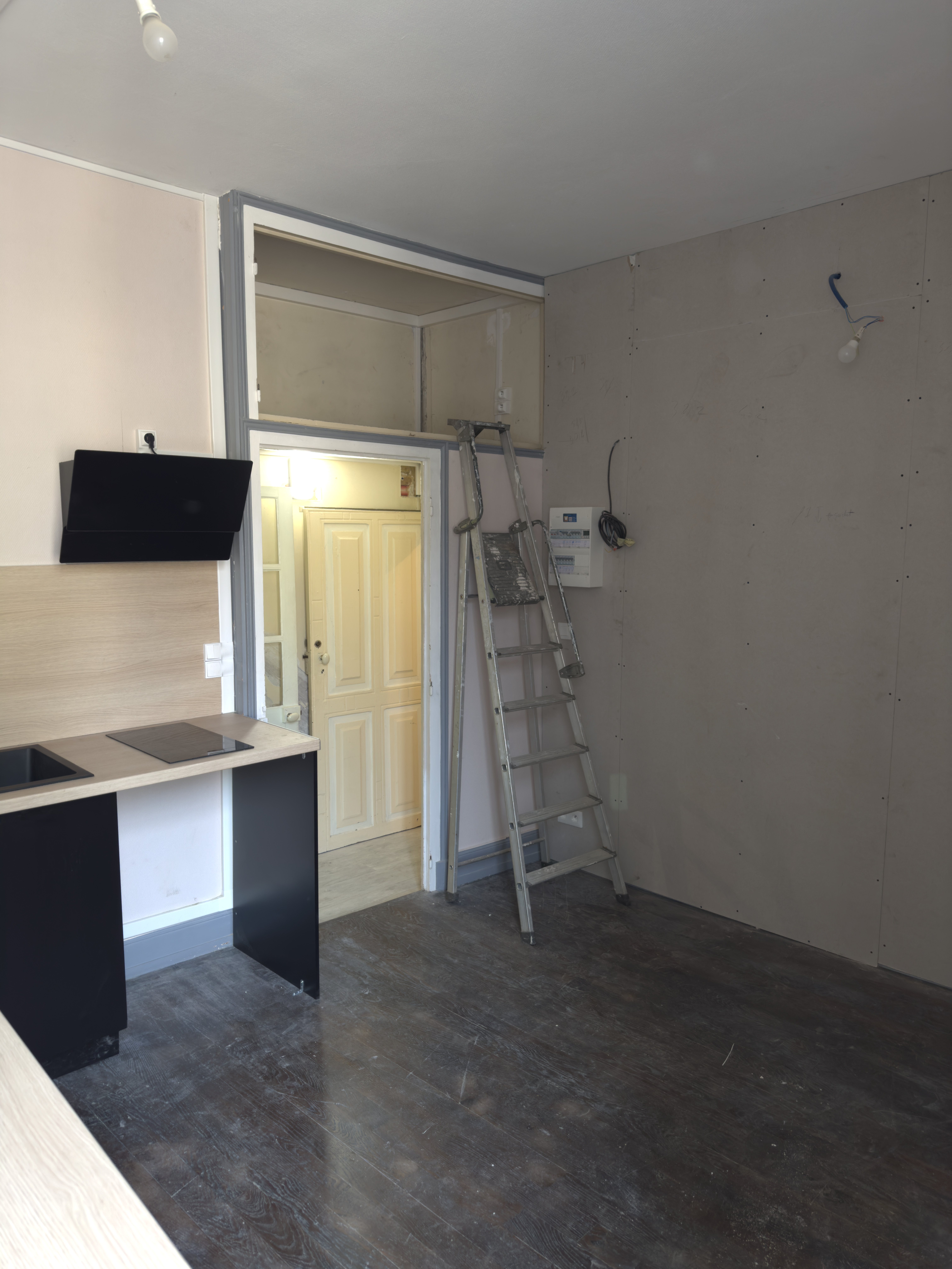 Studio en cours de rénovation avec création d'une mezzanine pour optimiser l'espace.