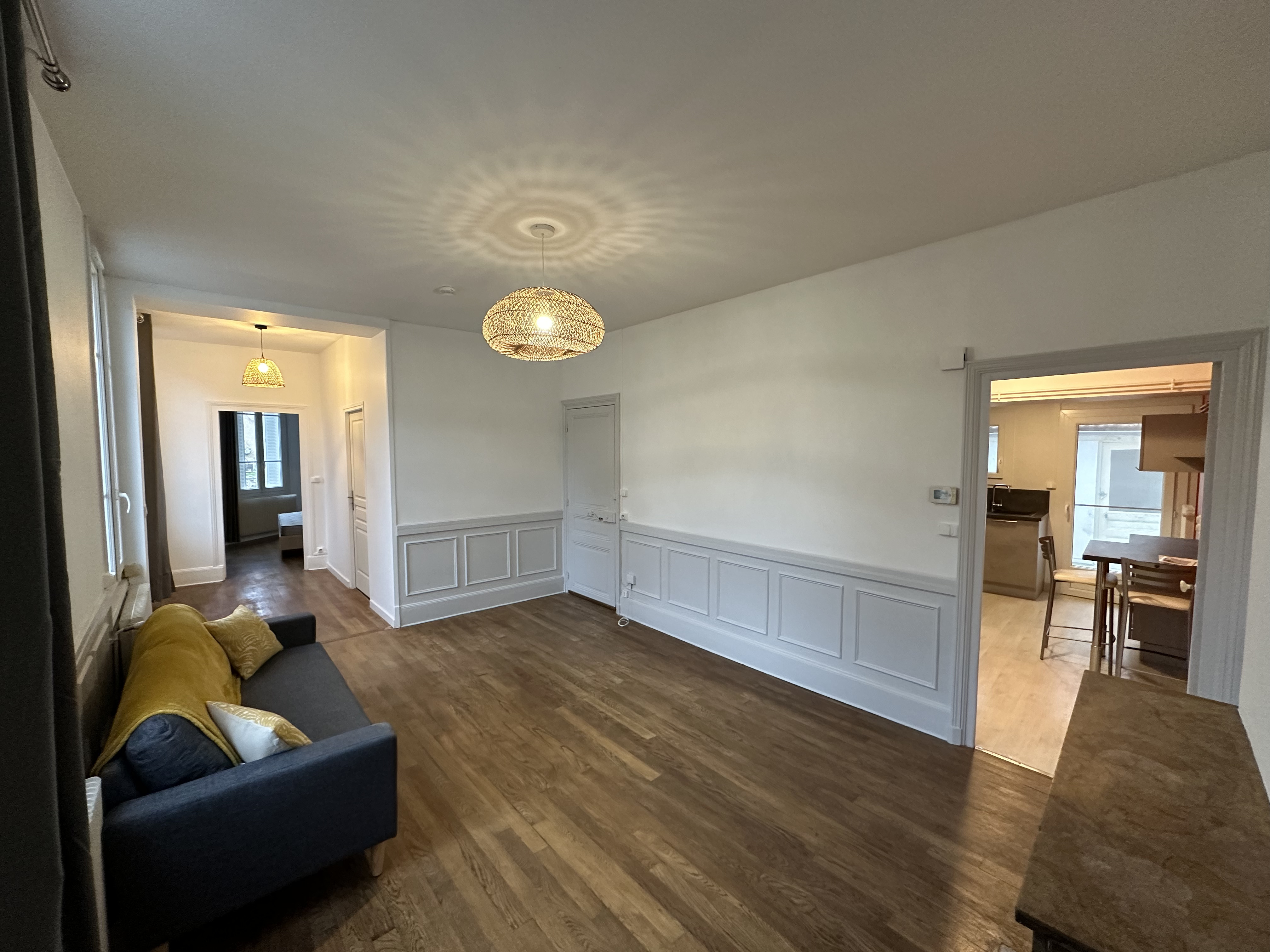 Salon aprÚs rénovation : ouverture, parquet rénové, peinture plafond, murs et soubassement.